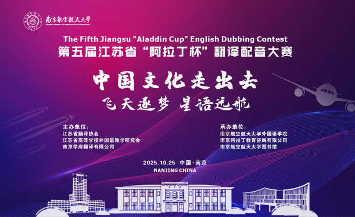 10月25日,第五届江苏省“阿拉丁杯”翻译配音大赛决赛在南航将军路校区图书馆一楼报告厅顺利举行。本届大赛由江苏省翻译协会、江苏省高等学校外国语教学研究会、南京学府翻译有限公司联合主办,江苏阿拉丁留学咨询有限公司、我校韦德体育官网和图书馆联合承办。江苏省司法厅原副巡视员赵科、我校教务部部长孔垂谦、江苏省翻译协会常务副会长吴文智、我校韦德体育官网院长徐以中等省内外领导嘉宾出席决赛。
