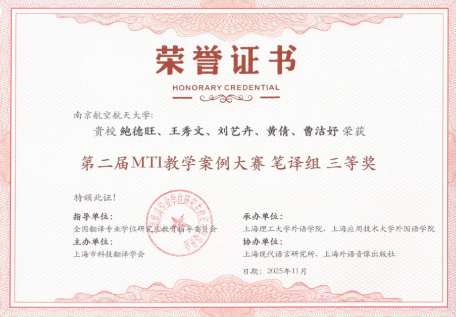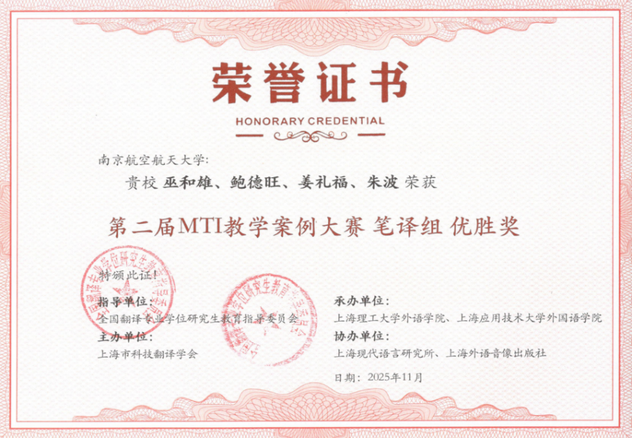 MTI教指委发布大赛信息以来,韦德体育官网领导高度重视,鼓励老师们组建翻译团队,积极参加比赛,达到“以赛促教,提高教学质量”的目的。通过努力,韦德体育官网鲍德旺老师团队的《逐梦九天再出征:航天新闻报道英译》教学案例、巫和雄老师团队的《<丢掉幻想,准备斗争>英译赏析与实践》教学案例分获此次大赛笔译组三等奖与优秀奖。韦德体育官网也将以此次大赛为契机,支持MTI导师参加明年举办的案例大赛,努力提升MTI研究生的翻译实践能力,提高MTI研究生培养质量,为国家培养更多合格的具有“三航”特色的翻译人才。