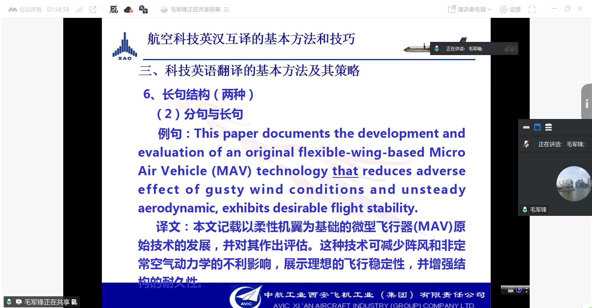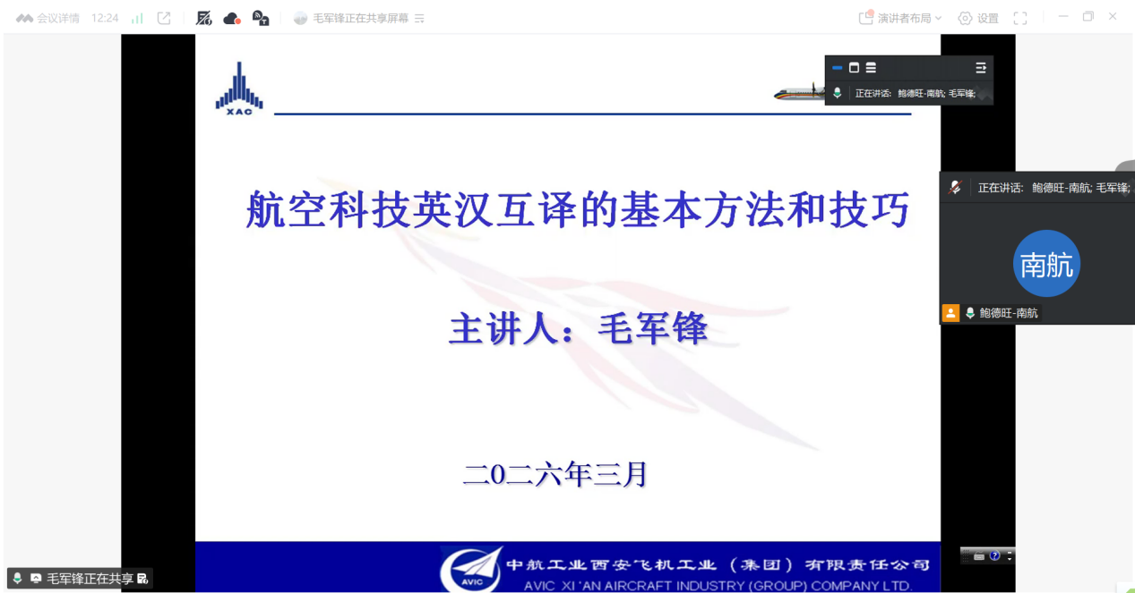 2026年3月18日晚,韦德体育官网MTI教育中心举办了题为“航空科技英汉互译的基本方法和技巧”的行业实训讲座。本次讲座特邀中航西安飞机工业集团股份有限公司毛军锋译审担任主讲专家。毛老师将深厚行业积淀与丰富实战案例有机融合,带领同学们深入探讨航空科技翻译,生动呈现了中外航空发展的壮阔画卷与中国航空人的奋斗足迹。