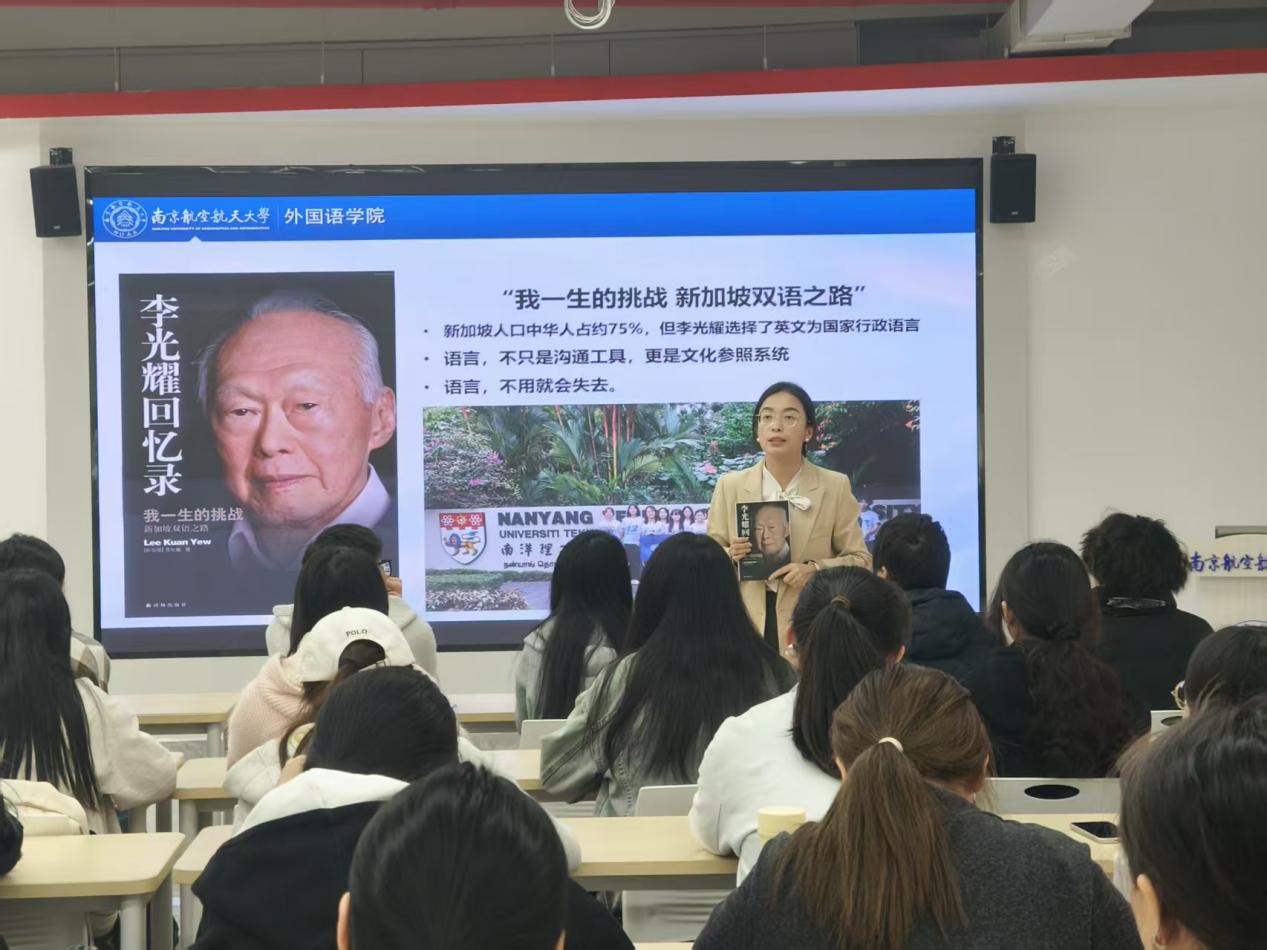 最后,吴科颖向同学们分享了李光耀的《我一生的挑战 新加坡双语之路》一书,她结合书中理念强调,语言不仅是沟通工具,更是文化参照系统,鼓励同学们珍惜语言学习机会、坚持语言实践,在多元文化视野中锤炼专业能力。同时,她也对同学们提出期许,希望大家以独立思考为指引,以清晰规划为抓手,以立即行动为保障,充分利用大学时光夯实专业基础、拓展综合能力,在多元发展路径中找准方向、奔赴未来。