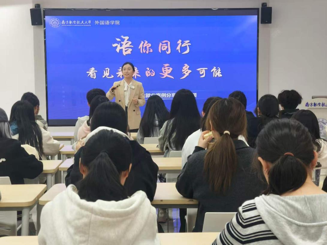 接下来,吴科颖对外语学子毕业去向进行全维度概括介绍,系统梳理韦德体育官网本研学生在国内升学、海外深造、就业领域、职业层次等方面的整体情况。她结合韦德体育官网多年数据,清晰呈现外语专业“教育、翻译、外贸、涉外企事业单位”等传统方向与“‘外语 +’跨领域就业”的新兴路径,全面展现外语专业多元发展前景,让同学们对自身发展方向形成直观认知。